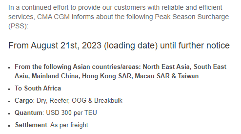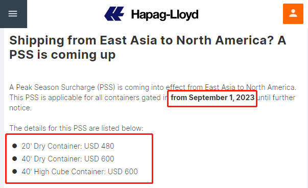 8日,赫伯羅特官網發布公告稱,自9月1日起,由東(dong) 亞(ya) 地區(包括中國)運往北美的貨物征收旺季附加費PSS(Peak Season Surcharge),PSS征收標準:20尺櫃:480美元,40尺及高櫃600美元。