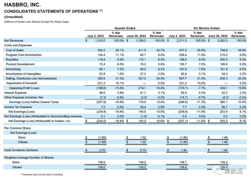 7、擁有“萬(wan) 智牌”、“小馬寶莉”、“小豬佩奇”等知名IP的美國玩具公司孩之寶Hasbro發布了2023年第二季度及上半年財務報告,2023年第二季度淨虧(kui) 損達到2.35億(yi) 美元,與(yu) 去年同期1.42億(yi) 美元的淨利潤相比,業(ye) 績可以說相當慘淡。