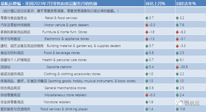 6、最航運整編的美國2023年7月零售和食品服務月銷售額環比和同比變化率,未計通貨膨脹。
