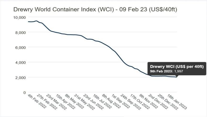 2月9日發布的數據顯示,WCI為(wei) 1997.22美元/FEU,較一周前下跌2%,與(yu) 2022年同期相比下跌79%。與(yu) 2021年9月的10377美元/FEU峰值相比,跌幅已達到81%;與(yu) 過去十年的平均運價(jia) 2693美元/FEU相比,也下跌了26%;不過,與(yu) 疫情暴發前的2019年1420美元/FEU的水平相比,仍高出41%。