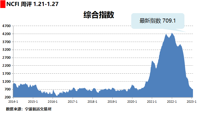 寧波航運交易所1月28日發布的信息顯示,本期(1月21日至1月27日)海上絲(si) 綢之路指數之寧波出口集裝箱運價(jia) 指數(NCFI)報收於(yu) 709.1點,較上期下跌1.0%。21條航線中有10條航線運價(jia) 指數上漲,11條航線運價(jia) 指數下跌。“海上絲(si) 綢之路”沿線地區主要港口中,6個(ge) 港口運價(jia) 指數上漲,10個(ge) 港口運價(jia) 指數下跌。看來船公司春節前後大量減並班控製運力並未達到維持運價(jia) 相對穩定的預期。