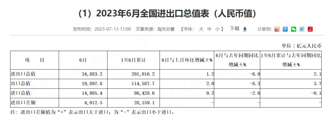 據海關(guan) 統計,今年上半年,我國貨物貿易進出口總值20.1萬(wan) 億(yi) 元,同比增長2.1%,其中出口11.46萬(wan) 億(yi) 元,同比增長3.7%;進口8.64萬(wan) 億(yi) 元,同比下降0.1%。
