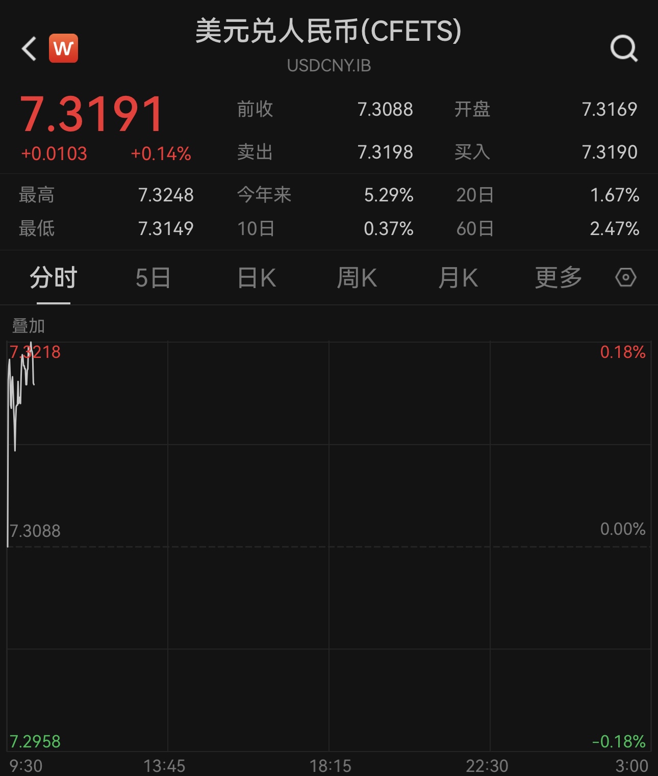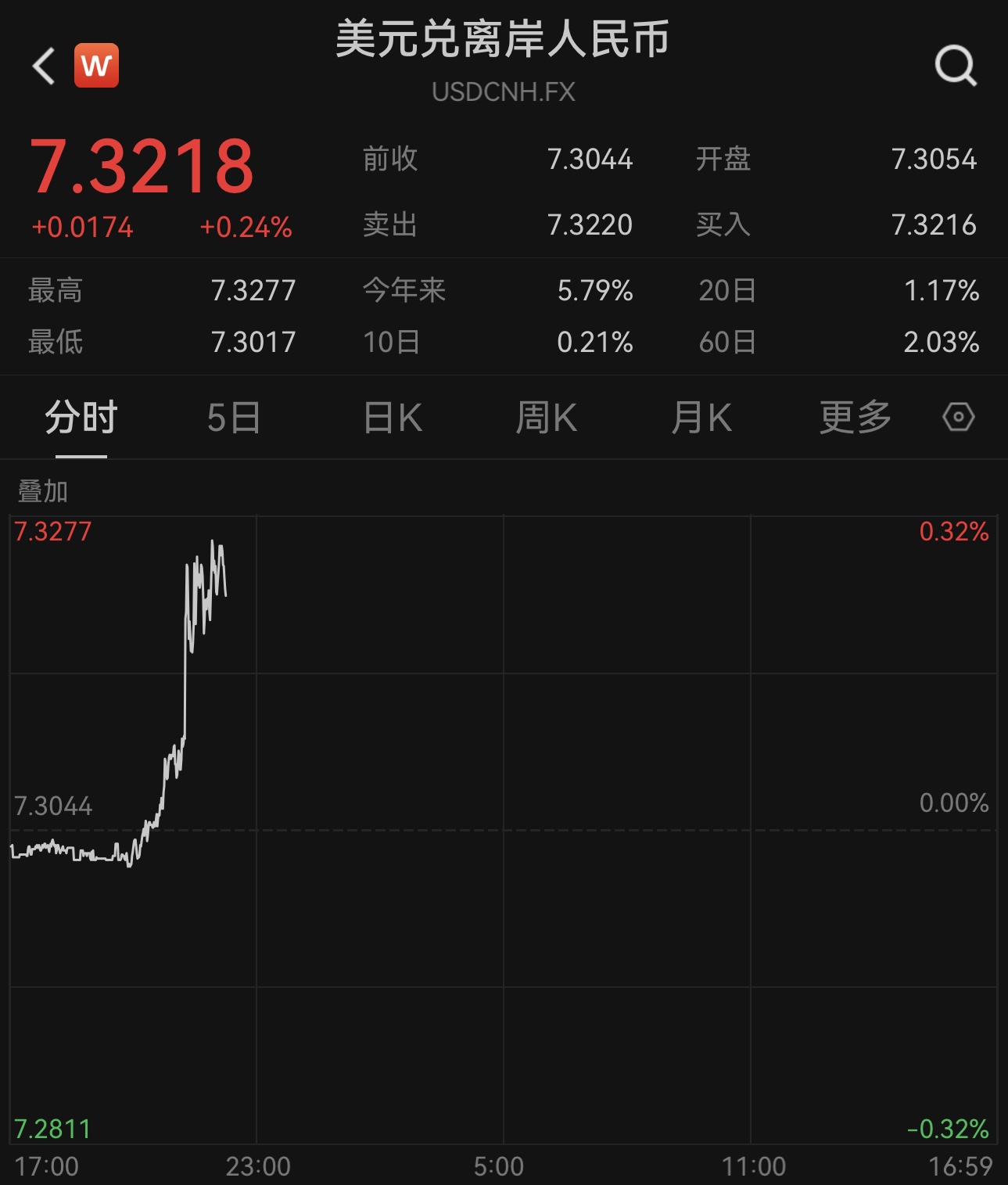 更多反映國際投資者預期的離岸人民幣對美元匯率同樣跌破7.32關(guan) 口,盤中最低至7.3277,較前一交易日下跌超過200點。
