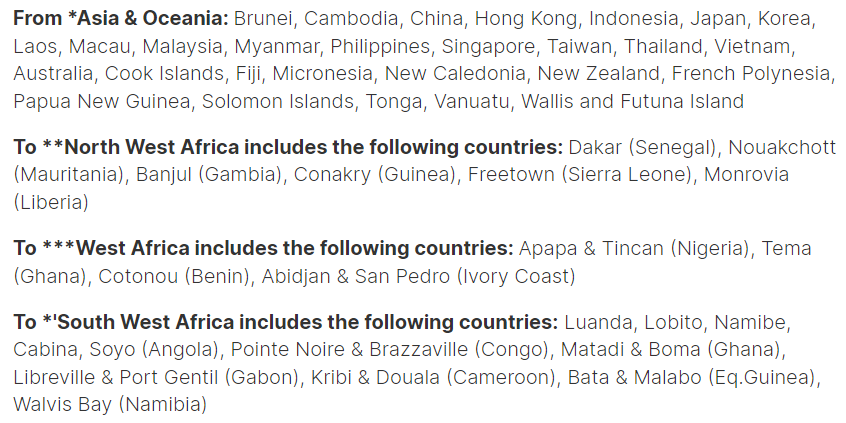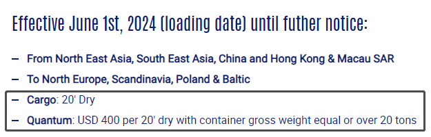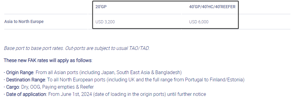 · FAK——從(cong) 亞(ya) 洲到北歐新適用的CMACGM各類貨運費率(*)如下: 2024年6月1日(裝貨日期)至另行通知時為(wei) 止: