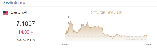 6月5日,人民幣中間價(jia) 報7.1097,下調14點,上一交易日中間價(jia) 報7.1083。