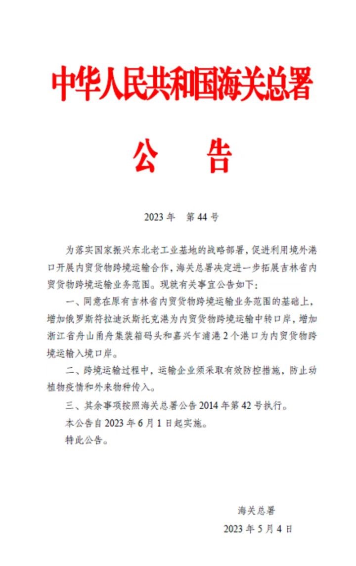 海關(guan) 總署近日發布關(guan) 於(yu) 進一步拓展吉林省內(nei) 貿貨物跨境運輸業(ye) 務範圍的公告,其中明確,同意在原有吉林省內(nei) 貿貨物跨境運輸業(ye) 務範圍的基礎上,增加俄羅斯符拉迪沃斯托克港為(wei) 內(nei) 貿貨物跨境運輸中轉口岸,增加浙江省舟山甬舟集裝箱碼頭和嘉興(xing) 乍浦港2個(ge) 港口為(wei) 內(nei) 貿貨物跨境運輸入境口岸。
