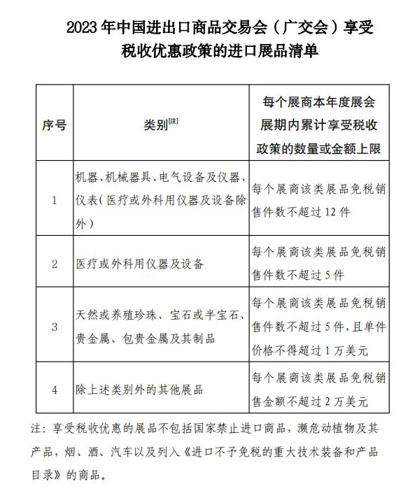近日,財政部、國家稅務總局、海關(guan) 總署聯合發布《關(guan) 於(yu) 2023年中國進出口商品交易會(hui) 展期內(nei) 銷售的進口展品稅收優(you) 惠政策的通知》(以下稱《通知》),決(jue) 定對2023年舉(ju) 辦的廣交會(hui) 在商務部確定的展期內(nei) 銷售的免稅額度內(nei) 的進口展品免征進口關(guan) 稅、進口環節增值稅和消費稅。